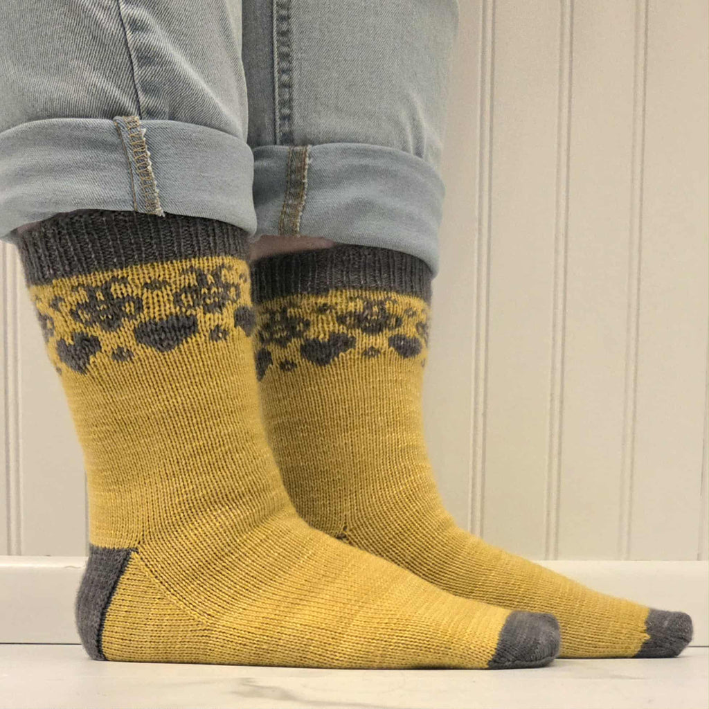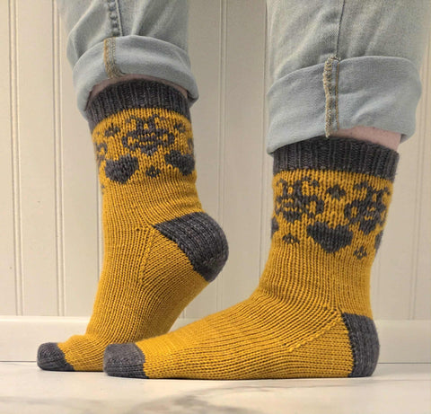 You’ll use stranded colorwork using an included chart, on the leg only a standard heel flap and gusset and a rounded wedge toe. (But feel free to substitute your favorite heel)